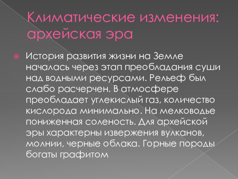 преобладания суши над водными ресурсами. Рельеф был слабо расчерчен. В атмосфере преобладает углекислый газ, количество кислорода минимально. На мелководье пониженная соленость. Для архейской эры характерны извержения вулканов, молнии, черные облака. Горные породы богаты графитом