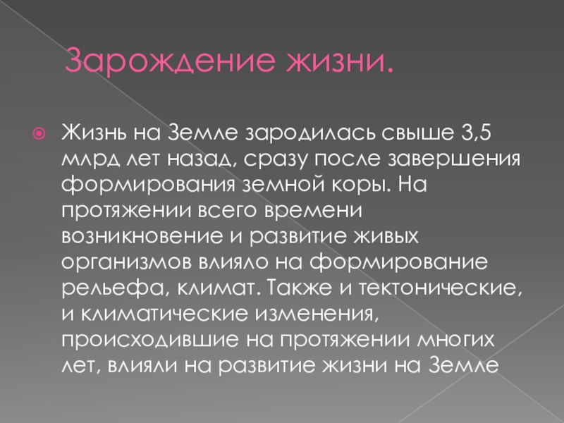 после завершения формирования земной коры. На протяжении всего времени возникновение и развитие живых организмов влияло на формирование рельефа, климат. Также и тектонические, и климатические изменения, происходившие на протяжении многих лет, влияли на развитие жизни на Земле