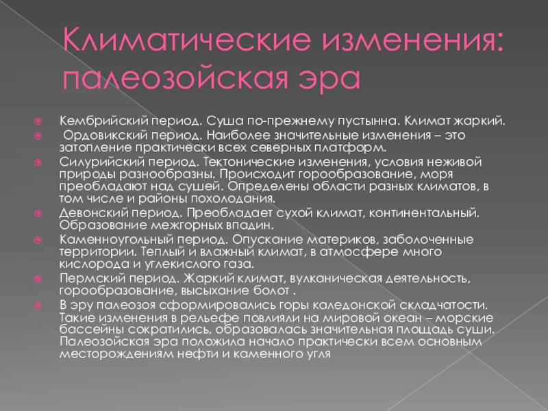 В эру палеозоя сформировались горы каледонской складчатости. Такие изменения в рельефе повлияли на мировой океан – морские бассейны сократились, образовалась значительная площадь суши. Палеозойская эра положила начало практически всем основным месторождениям нефти и каменного угля