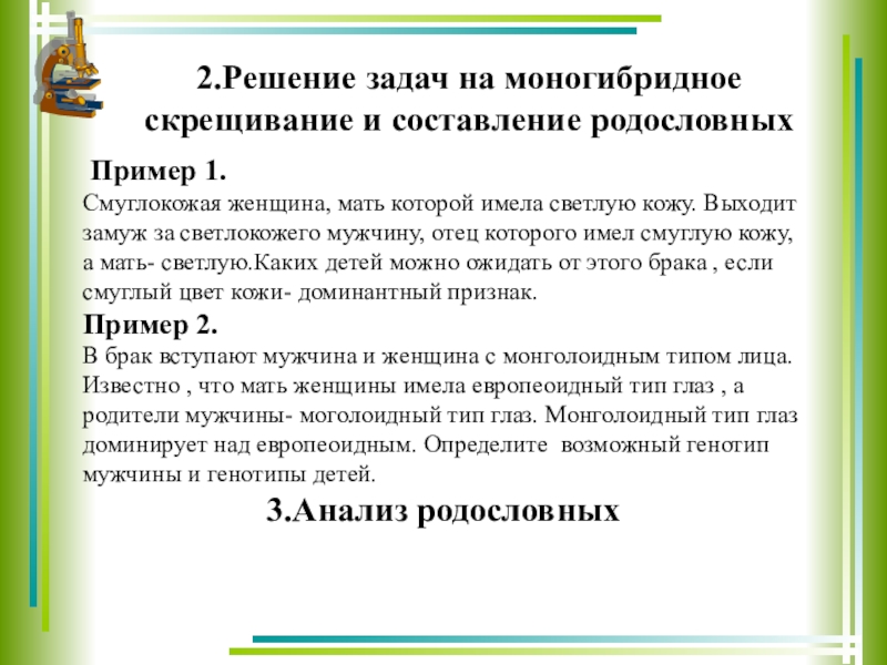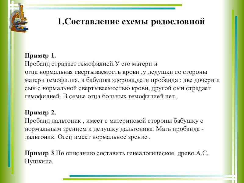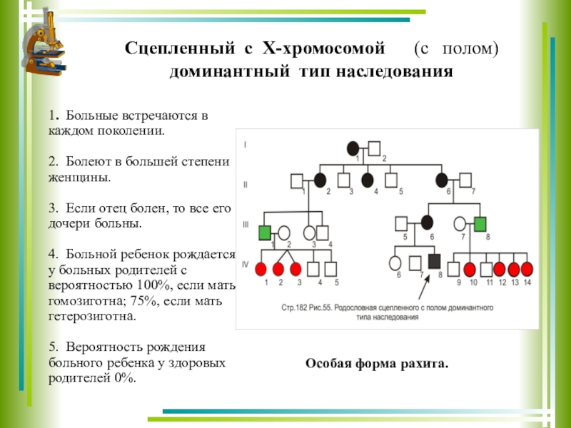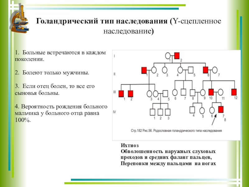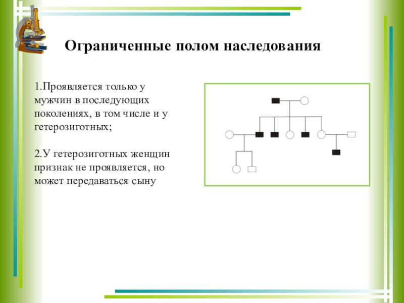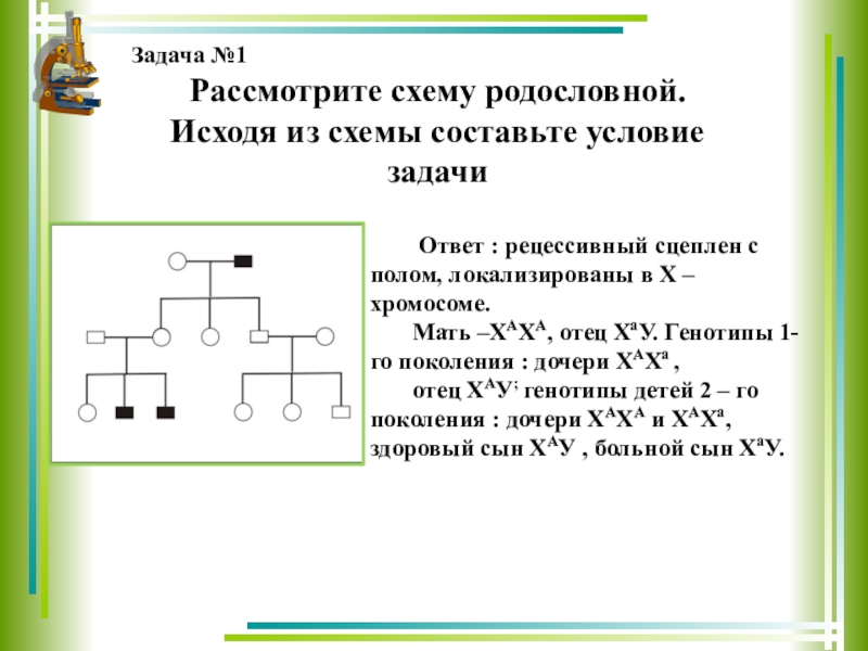 является в каждом поколении. От брака 1—2, где отец является носителем признака, родился сын, имеющий