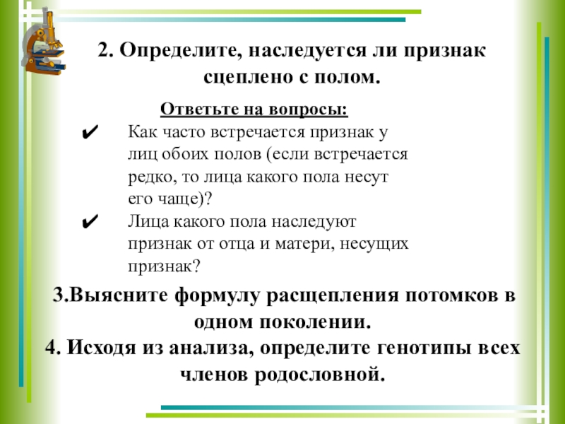 Определяем, аутосомным или сцепленным с полом является признак. В равной степени носителями признака являются лица как мужского, так и женского пола. Это свидетельствует о том, что данный признак является аутосомным.