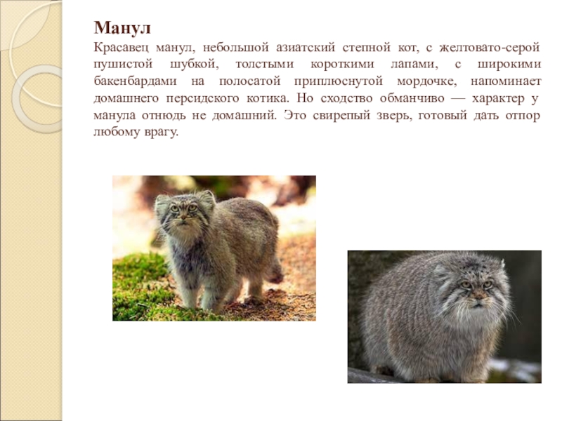 короткими лапами, с широкими бакенбардами на полосатой приплюснутой мордочке, напоминает домашнего персидского котика. Но сходство обманчиво — характер у манула отнюдь не домашний. Это свирепый зверь, готовый дать отпор любому врагу.