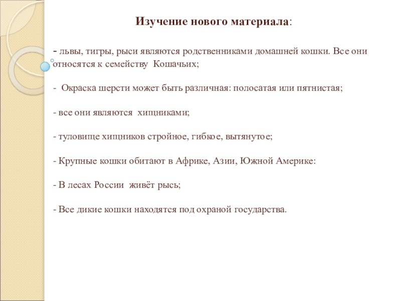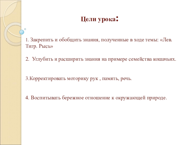 1. Закрепить и обобщить знания, полученные в ходе темы: «Лев. Тигр. Рысь»