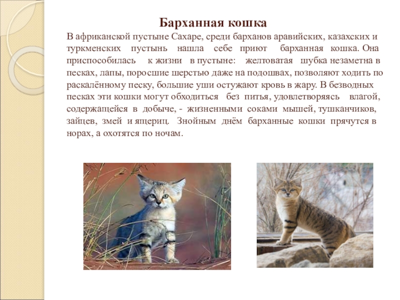 В африканской пустыне Сахаре, среди барханов аравийских, казахских и туркменских пустынь нашла себе приют барханная кошка. Она приспособилась к жизни в пустыне: желтоватая шубка незаметна в песках, лапы, поросшие шерстью даже на подошвах, позволяют ходить по раскалённому песку, большие уши остужают кровь в жару. В безводных песках эти кошки могут обходиться без питья, удовлетворяясь влагой, содержащейся в добыче, - жизненными соками мышей, тушканчиков, зайцев, змей и ящериц. Знойным днём барханные кошки прячутся в норах, а охотятся по ночам.