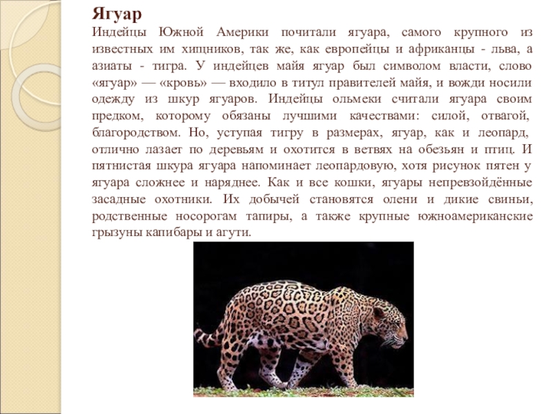 так же, как европейцы и африканцы - льва, а азиаты - тигра. У индейцев майя ягуар был символом власти, слово «ягуар» — «кровь» — входило в титул правителей майя, и вожди носили одежду из шкур ягуаров. Индейцы ольмеки считали ягуара своим предком, которому обязаны лучшими качествами: силой, отвагой, благородством. Но, уступая тигру в размерах, ягуар, как и леопард, отлично лазает по деревьям и охотится в ветвях на обезьян и птиц. И пятнистая шкура ягуара напоминает леопардовую, хотя рисунок пятен у ягуара сложнее и наряднее. Как и все кошки, ягуары непревзойдённые засадные охотники. Их добычей становятся олени и дикие свиньи, родственные носорогам тапиры, а также крупные южноамериканские грызуны капибары и агути.