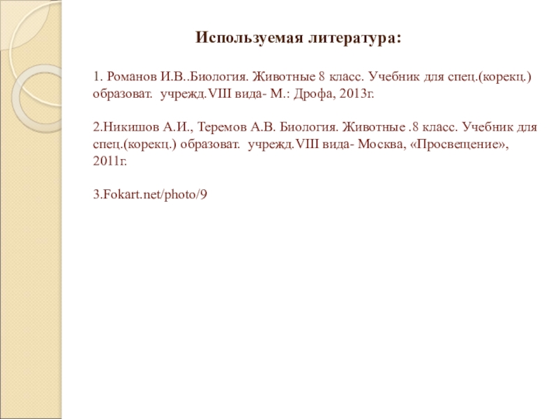 1. Романов И.В..Биология. Животные 8 класс. Учебник для спец.(корекц.) образоват. учрежд.VIII вида- М.: Дрофа, 2013г.