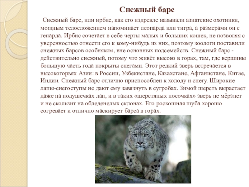 Снежный барс, или ирбис, как его издревле называли азиатские охотники, мощным телосложением напоминает леопарда или тигра, а размерами он с гепарда. Ирбис сочетает в себе черты малых и больших кошек, не позволяя с уверенностью отнести его к кому-нибудь из них, поэтому зоологи поставили снежных барсов особняком, вне основных подсемейств. Снежный барс - действительно снежный, потому что живёт высоко в горах, там, где вершины большую часть года покрыты снегами. Этот редкий зверь встречается в высокогорьях Азии: в России, Узбекистане, Казахстане, Афганистане, Китае, Индии. Снежный барс отлично приспособлен к холоду и снегу. Широкие лапы-снегоступы не дают ему завязнуть в сугробах. Зимой шерсть вырастает даже на подушечках лап, и в таких «шерстяных носочках» зверь не мёрзнет и не скользит на обледенелых склонах. Его роскошная шуба хорошо согревает и отлично маскирует барса в горах.