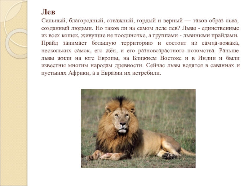 людьми. Но таков ли на самом деле лев? Львы - единственные из всех кошек, живущие не поодиночке, а группами - львиными прайдами. Прайд занимает большую территорию и состоит из самца-вожака, нескольких самок, его жён, и его разновозрастного потомства. Раньше львы жили на юге Европы, на Ближнем Востоке и в Индии и были известны многим народам древности. Сейчас львы водятся в саваннах и пустынях Африки, а в Евразии их истребили.