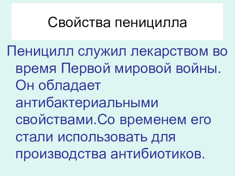 Свойства пенициллаПеницилл служил лекарством во время Первой мировой войны. Он обладает антибактериальными свойствами.Со временем его стали использовать