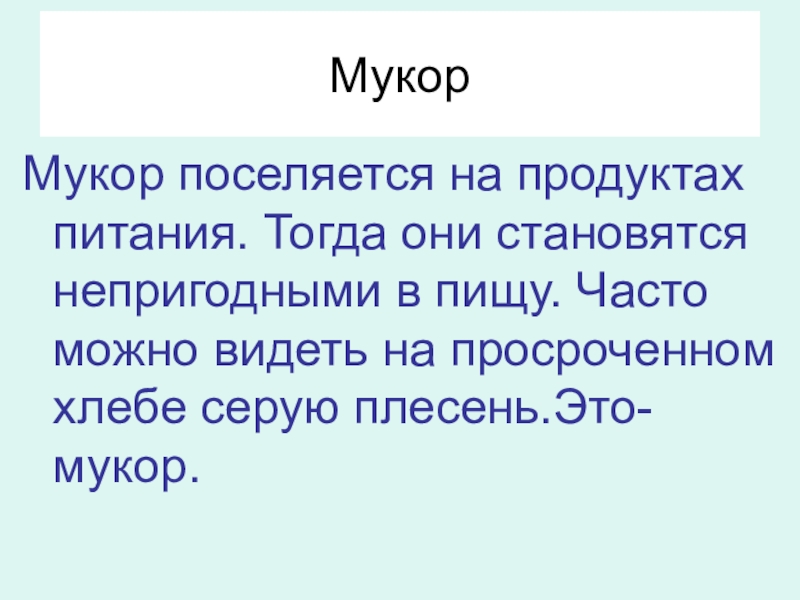 МукорМукор поселяется на продуктах питания. Тогда они становятся непригодными в пищу. Часто можно видеть на просроченном хлебе