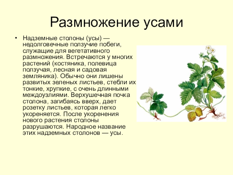 размножения. Встречаются у многих растений (костяника, полевица ползучая, лесная и садовая земляника). Обычно они лишены развитых зеленых листьев, стебли их тонкие, хрупкие, с очень длинными междоузлиями. Верхушечная почка столона, загибаясь вверх, дает розетку листьев, которая легко укореняется. После укоренения нового растения столоны разрушаются. Народное название этих надземных столонов — усы.