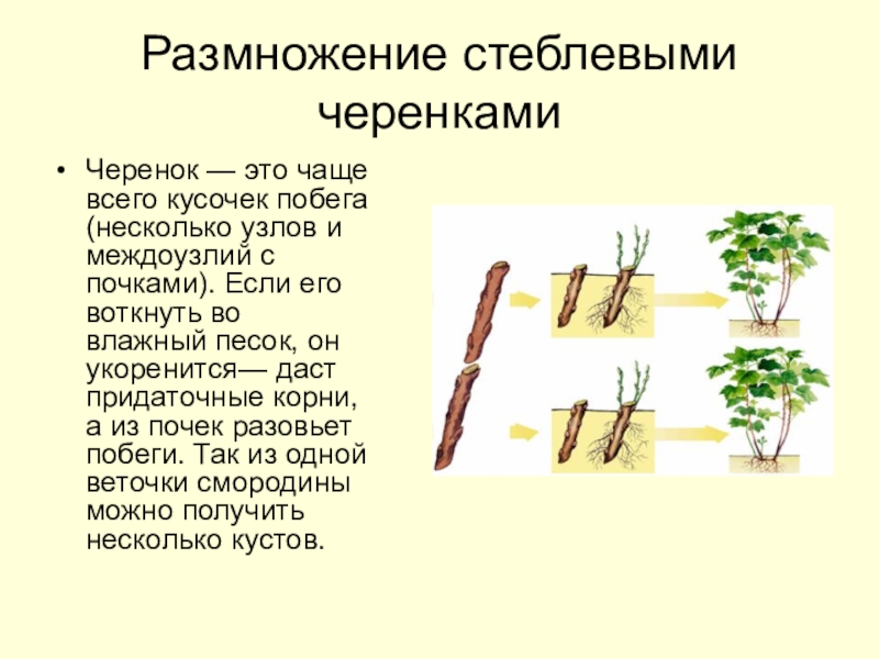 и междоузлий с почками). Если его воткнуть во влажный песок, он укоренится— даст придаточные корни, а из почек разовьет побеги. Так из одной веточки смородины можно получить несколько кустов.