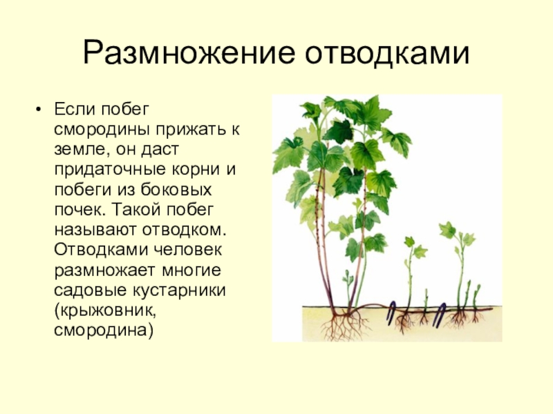 и побеги из боковых почек. Такой побег называют отводком. Отводками человек размножает многие садовые кустарники (крыжовник, смородина)