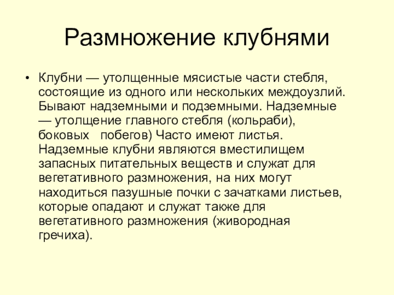 нескольких междоузлий. Бывают надземными и подземными. Надземные — утолщение главного стебля (кольраби), боковых побегов) Часто имеют листья. Надземные клубни являются вместилищем запасных питательных веществ и служат для вегетативного размножения, на них могут находиться пазушные почки с зачатками листьев, которые опадают и служат также для вегетативного размножения (живородная гречиха).