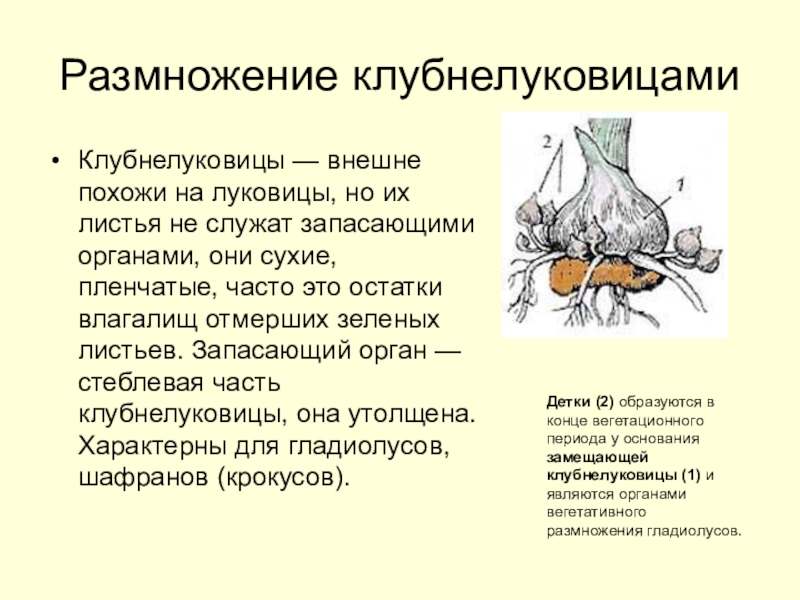 Детки (2) образуются в конце вегетационного периода у основания замещающей клубнелуковицы (1) и являются органами вегетативного размножения гладиолусов.