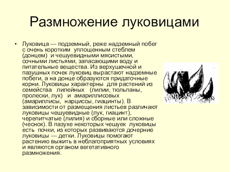 стеблем (донцем) и чешуевидными мясистыми, сочными листьями, запасающими воду и питательные вещества. Из верхушечной и пазушных почек луковиц вырастают надземные побеги, а на донце образуются придаточные корни. Луковицы характерны для растений из семейства лилейных (лилии, тюльпаны, пролески, лук) и амариллисовых (амариллисы, нарциссы, гиацинты). В зависимости от размещения листьев различают луковицы чешуевидные (лук, гиацинт), черепитчатые (лилия) и сборные или сложные (чеснок). В пазухе некоторых чешуек луковицы есть почки, из которых развиваются дочерние луковицы — детки. Луковицы помогают растению выжить в неблагоприятных условиях и являются органом вегетативного размножения.