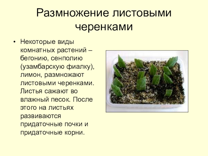 лимон, размножают листовыми черенками. Листья сажают во влажный песок. После этого на листьях развиваются придаточные почки и придаточные корни.