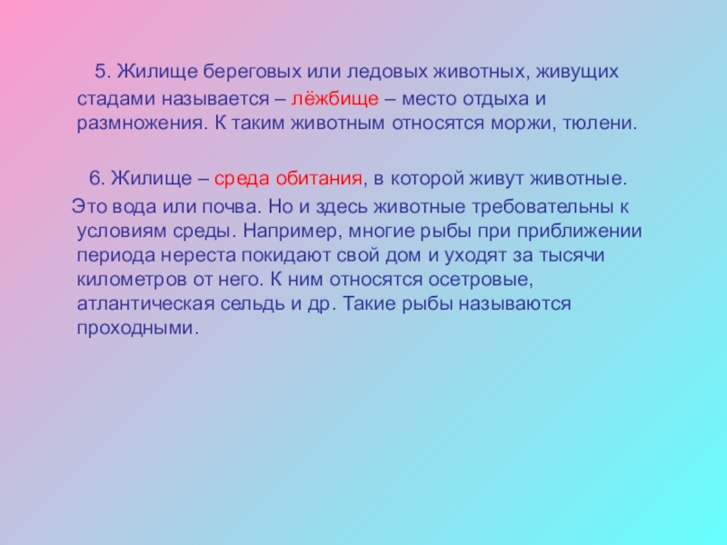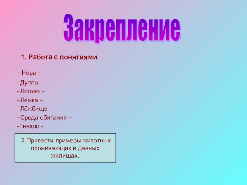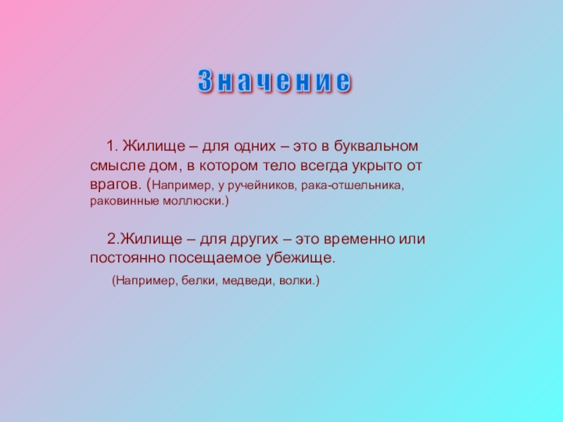 1. Жилище – это дупло – расщелина в дереве или скале, пещере, где может укрыться одно животное или много.