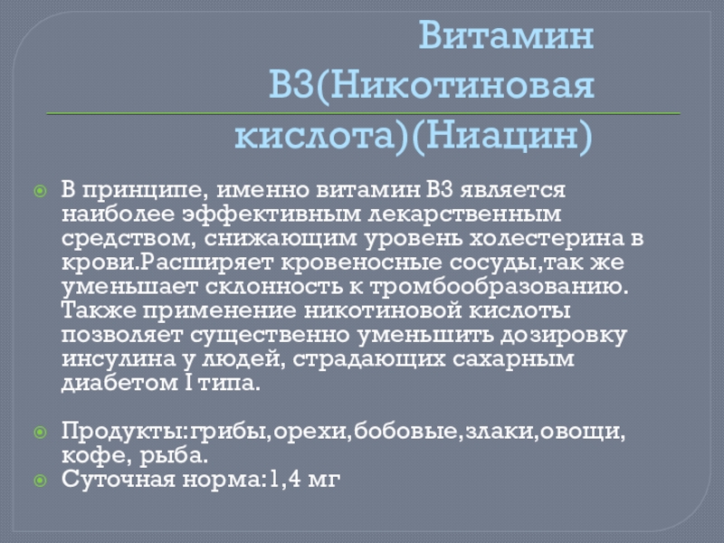 лекарственным средством, снижающим уровень холестерина в крови.Расширяет кровеносные сосуды,так же уменьшает склонность к тромбообразованию. Также применение никотиновой кислоты позволяет существенно уменьшить дозировку инсулина у людей, страдающих сахарным диабетом I типа.