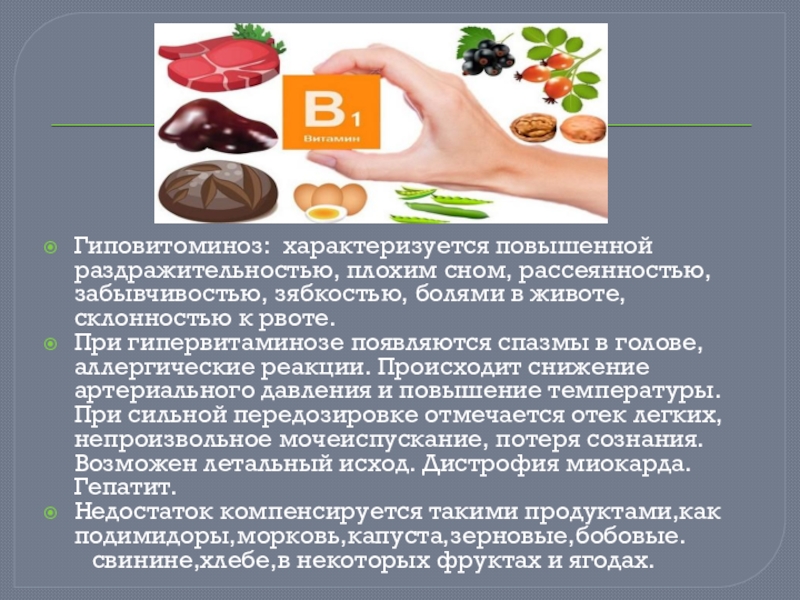 Слайд 3Гиповитоминоз: характеризуется повышенной раздражительностью, плохим сном, рассеянностью, забывчивостью, зябкостью, болями в