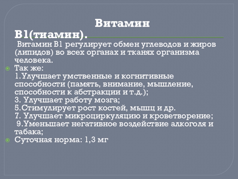 Витамин В1 регулирует обмен углеводов и жиров (липидов) во всех органах и тканях организма человека.