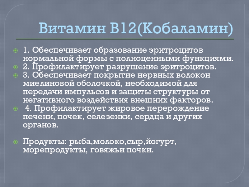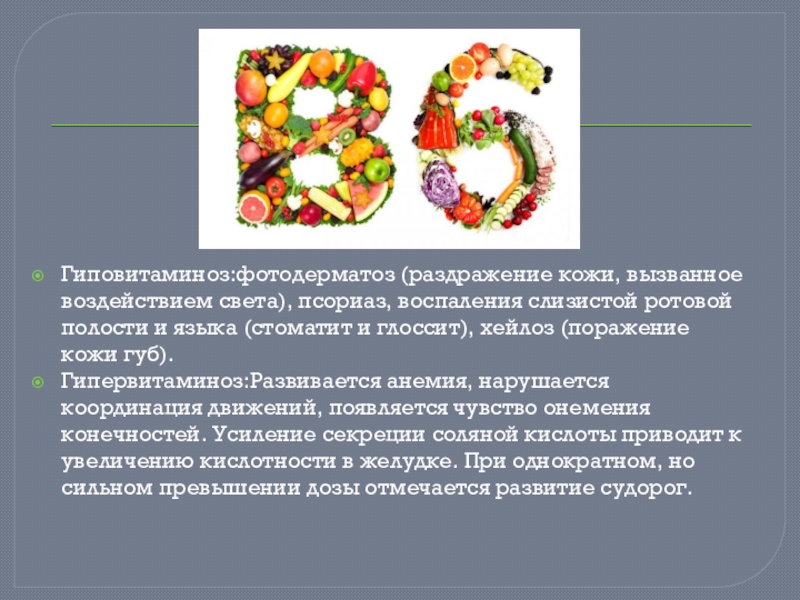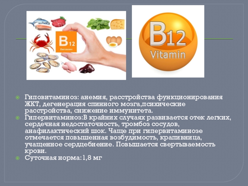 Слайд 9Гиповитаминоз: анемия, расстройства функционирования ЖКТ, дегенерация спинного мозга,психические расстройства, снижение иммунитета.