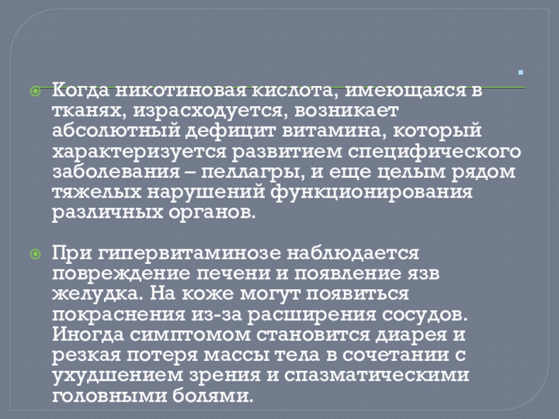 Когда никотиновая кислота, имеющаяся в тканях, израсходуется, возникает абсолютный дефицит витамина,