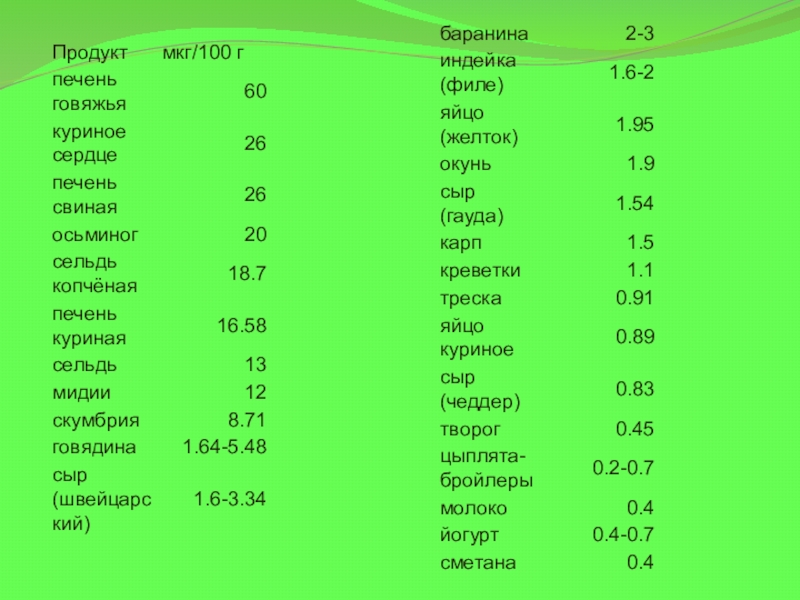 Слайд 12Фолиевая кислота в пищевых продуктах