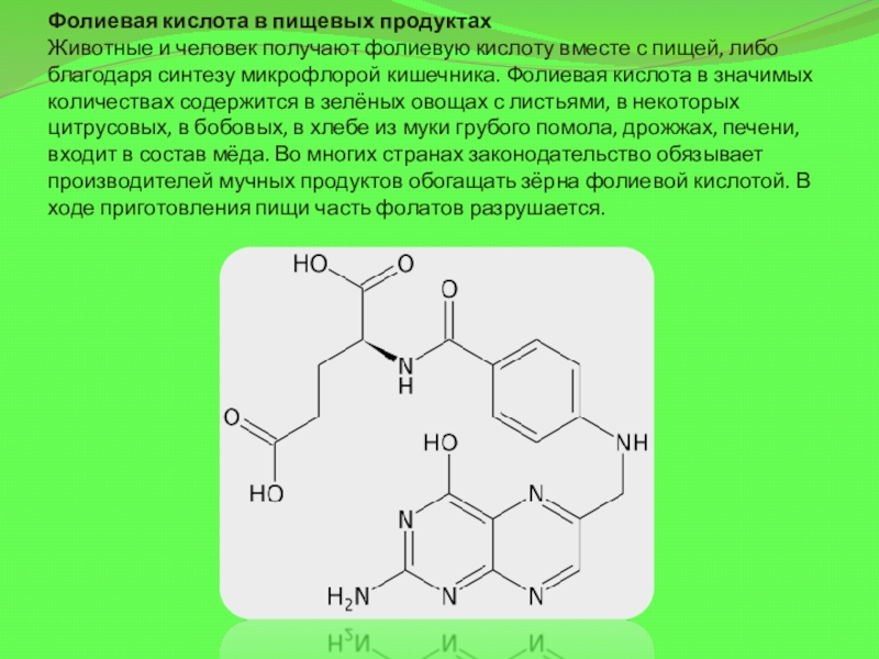 с пищей, либо благодаря синтезу микрофлорой кишечника. Фолиевая кислота в значимых количествах содержится в зелёных овощах с листьями, в некоторых цитрусовых, в бобовых, в хлебе из муки грубого помола, дрожжах, печени, входит в состав мёда. Во многих странах законодательство обязывает производителей мучных продуктов обогащать зёрна фолиевой кислотой. В ходе приготовления пищи часть фолатов разрушается.