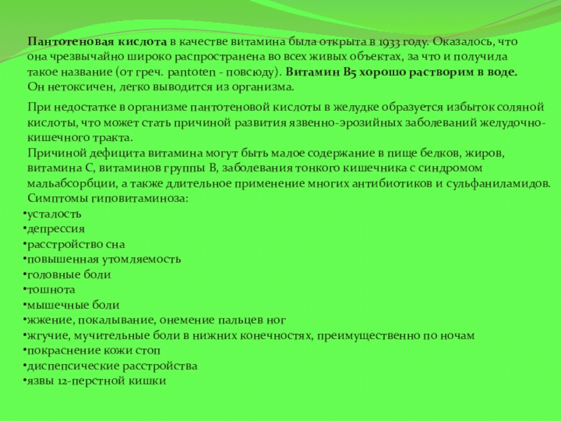 что она чрезвычайно широко распространена во всех живых объектах, за что и получила такое название (от греч. pantoten - повсюду). Витамин В5 хорошо растворим в воде. Он нетоксичен, легко выводится из организма.