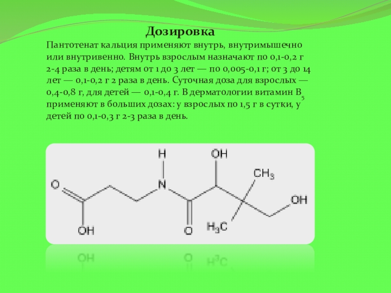 0,1-0,2 г 2-4 раза в день; детям от 1 до 3 лет — по 0,005-0,1 г; от 3 до 14 лет — 0,1-0,2 г 2 раза в день. Суточная доза для взрослых — 0,4-0,8 г, для детей — 0,1-0,4 г. В дерматологии витамин B5 применяют в больших дозах: у взрослых по 1,5 г в сутки, у детей по 0,1-0,3 г 2-3 раза в день.