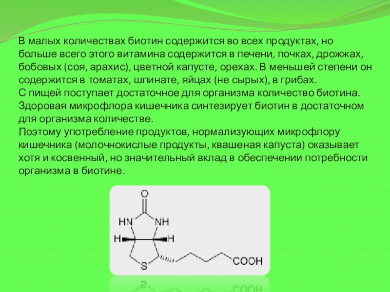Слайд 10В малых количествах биотин содержится во всех продуктах, но больше всего