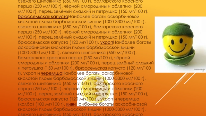 барбадосской вишни (1000-3300 мг/100 г), свежего шиповникаНаиболее богаты аскорбиновой кислотой плоды барбадосской вишни (1000-3300 мг/100 г), свежего шиповника (650 мг/100 г), болгарского красного перцаНаиболее богаты аскорбиновой кислотой плоды барбадосской вишни (1000-3300 мг/100 г), свежего шиповника (650 мг/100 г), болгарского красного перца (250 мг/100 г), чёрной смородиныНаиболее богаты аскорбиновой кислотой плоды барбадосской вишни (1000-3300 мг/100 г), свежего шиповника (650 мг/100 г), болгарского красного перца (250 мг/100 г), чёрной смородины и облепихиНаиболее богаты аскорбиновой кислотой плоды барбадосской вишни (1000-3300 мг/100 г), свежего шиповника (650 мг/100 г), болгарского красного перца (250 мг/100 г), чёрной смородины и облепихи (200 мг/100 г), перец зелёный сладкийНаиболее богаты аскорбиновой кислотой плоды барбадосской вишни (1000-3300 мг/100 г), свежего шиповника (650 мг/100 г), болгарского красного перца (250 мг/100 г), чёрной смородины и облепихи (200 мг/100 г), перец зелёный сладкий и петрушкаНаиболее богаты аскорбиновой кислотой плоды барбадосской вишни (1000-3300 мг/100 г), свежего шиповника (650 мг/100 г), болгарского красного перца (250 мг/100 г), чёрной смородины и облепихи (200 мг/100 г), перец зелёный сладкий и петрушка (150 мг/100 г), брюссельская капустаНаиболее богаты аскорбиновой кислотой плоды барбадосской вишни (1000-3300 мг/100 г), свежего шиповника (650 мг/100 г), болгарского красного перца (250 мг/100 г), чёрной смородины и облепихи (200 мг/100 г), перец зелёный сладкий и петрушка (150 мг/100 г), брюссельская капуста (120 мг/100 г), укропНаиболее богаты аскорбиновой кислотой плоды барбадосской вишни (1000-3300 мг/100 г), свежего шиповника (650 мг/100 г), болгарского красного перца (250 мг/100 г), чёрной смородины и облепихи (200 мг/100 г), перец зелёный сладкий и петрушка (150 мг/100 г), брюссельская капуста (120 мг/100 г), укроп и черемшаНаиболее богаты аскорбиновой кислотой плоды барбадосской вишни (1000-3300 мг/100 г), свежего шиповника (650 мг/100 г), болгарского красного перца (250 мг/100 г), чёрной смородины и облепихи (200 мг/100 г), перец зелёный сладкий и петрушка (150 мг/100 г), брюссельская капуста (120 мг/100 г), укроп и черемша (колба) (100 мг/100 г), кивиНаиболее богаты аскорбиновой кислотой плоды барбадосской вишни (1000-3300 мг/100 г), свежего шиповника (650 мг/100 г), болгарского красного перца (250 мг/100 г), чёрной смородины и облепихи (200 мг/100 г), перец зелёный сладкий и петрушка (150 мг/100 г), брюссельская капуста (120 мг/100 г), укроп и черемша (колба) (100 мг/100 г), киви (90 мг/100 г), земляника садоваяНаиболее богаты аскорбиновой кислотой плоды барбадосской вишни (1000-3300 мг/100 г), свежего шиповника (650 мг/100 г), болгарского красного перца (250 мг/100 г), чёрной смородины и облепихи (200 мг/100 г), перец зелёный сладкий и петрушка (150 мг/100 г), брюссельская капуста (120 мг/100 г), укроп и черемша (колба) (100 мг/100 г), киви (90 мг/100 г), земляника садовая (60 мг/100 г), цитрусовые (38-60 мг/100 г)[14], яблоки, яблоки (содержат 4,6 мг/100 г), недозрелые плоды грецкого ореха, яблоки (содержат 4,6 мг/100 г), недозрелые плоды грецкого ореха, хвоя, яблоки (содержат 4,6 мг/100 г), недозрелые плоды грецкого ореха, хвоя сосны, яблоки (содержат 4,6 мг/100 г), недозрелые плоды грецкого ореха, хвоя сосны и пихты