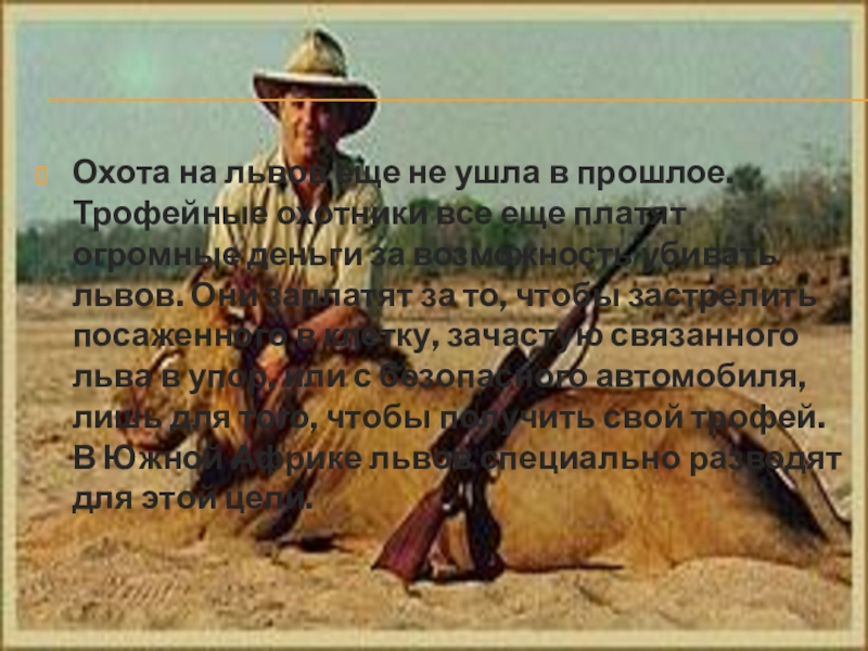 Слайд 15Охота на львов еще не ушла в прошлое. Трофейные охотники все