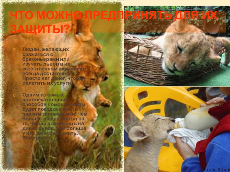Одним из самых привлекательных способов помощи львам будет поездка к ним, в парки и заповедники! Чем больше людей платят за то, чтобы посмотреть на диких львов, тем больше у них шансов выжить. Всё просто.