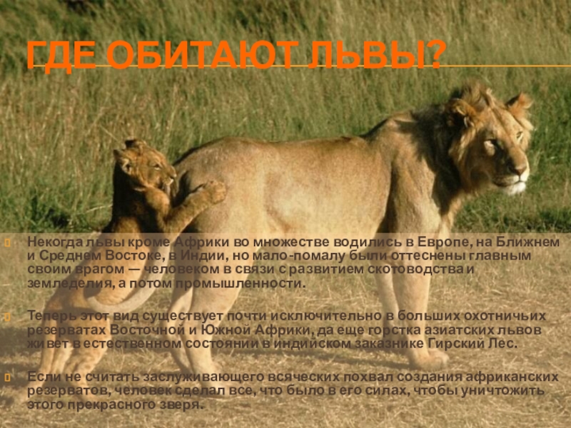 Теперь этот вид существует почти исключительно в больших охотничьих резерватах Восточной и Южной Африки, да еще горстка азиатских львов живет в естественном состоянии в индийском заказнике Гирский Лес.
