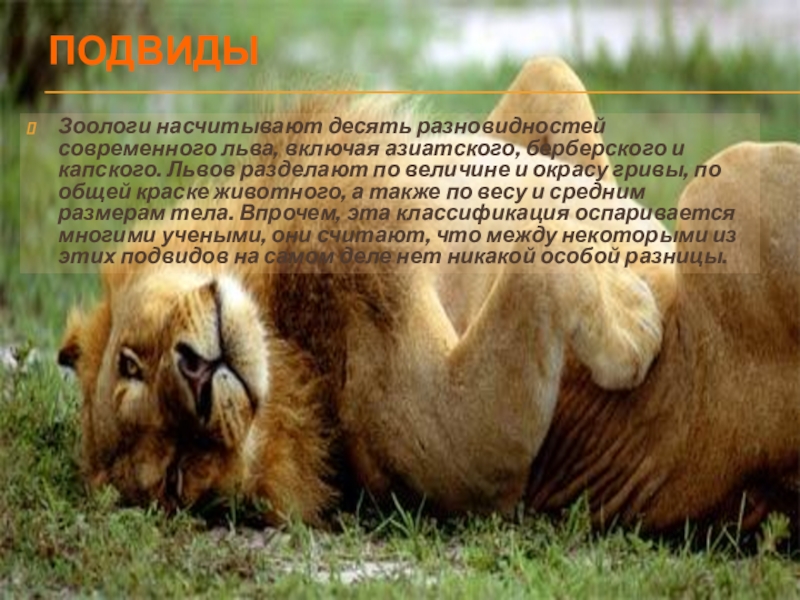 Львов разделают по величине и окрасу гривы, по общей краске животного, а также по весу и средним размерам тела. Впрочем, эта классификация оспаривается многими учеными, они считают, что между некоторыми из этих подвидов на самом деле нет никакой особой разницы.