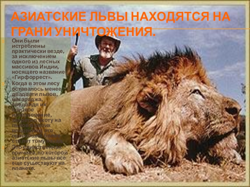 Слайд 14АЗИАТСКИЕ ЛЬВЫ НАХОДЯТСЯ НА ГРАНИ УНИЧТОЖЕНИЯ.