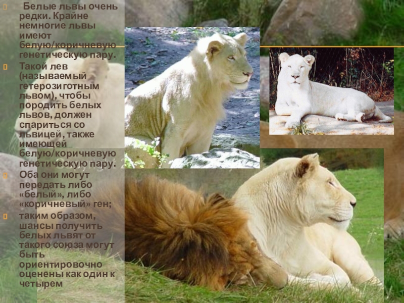 Слайд 10 Белые львы очень редки. Крайне немногие львы имеют белую/коричневую генетическую пару.