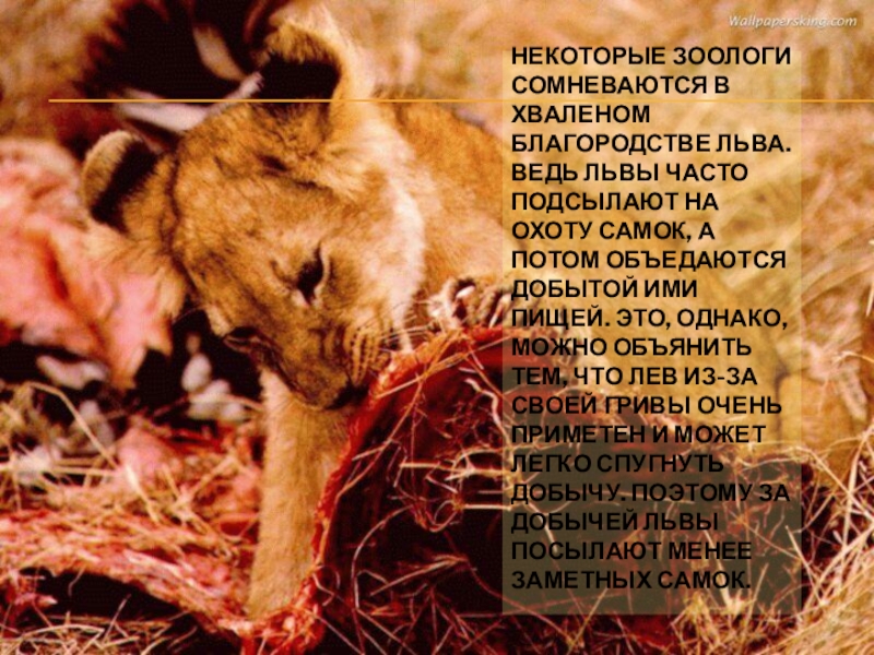 Слайд 4НЕКОТОРЫЕ ЗООЛОГИ СОМНЕВАЮТСЯ В ХВАЛЕНОМ БЛАГОРОДСТВЕ ЛЬВА. ВЕДЬ ЛЬВЫ ЧАСТО ПОДСЫЛАЮТ