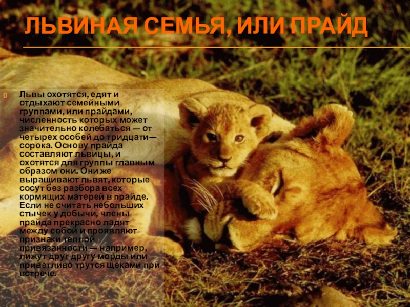 или прайдами, численность которых может значительно колебаться — от четырех особей до тридцати—сорока. Основу прайда составляют львицы, и охотятся для группы главным образом они. Они же выращивают львят, которые сосут без разбора всех кормящих матерей в прайде. Если не считать небольших стычек у добычи, члены прайда прекрасно ладят между собой и проявляют признаки теплой привязанности — например, лижут друг другу морды или приветливо трутся щеками при встрече.