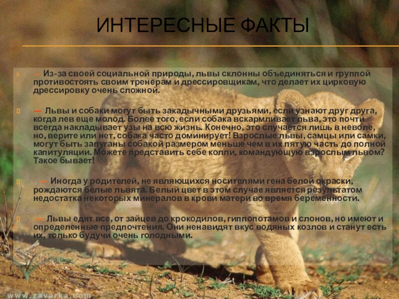— Львы и собаки могут быть закадычными друзьями, если узнают друг друга, когда лев еще молод. Более того, если собака вскармливает льва, это почти всегда накладывает узы на всю жизнь. Конечно, это случается лишь в неволе, но, верите или нет, собака часто доминирует! Взрослые львы, самцы или самки, могут быть запуганы собакой размером меньше чем в их пятую часть до полной капитуляции. Можете представить себе колли, командующую взрослым львом? Такое бывает!