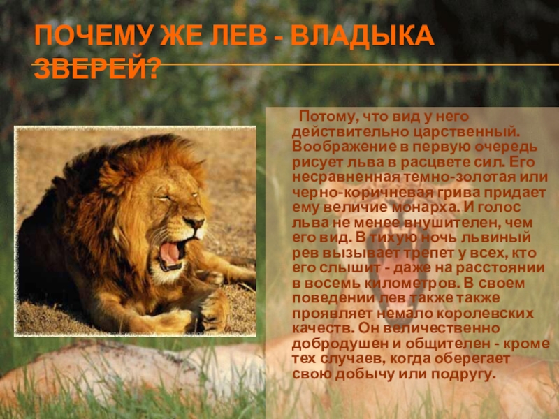 Слайд 3ПОЧЕМУ ЖЕ ЛЕВ - ВЛАДЫКА ЗВЕРЕЙ?