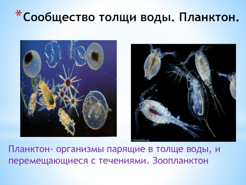 Сообщество толщи воды. Планктон. Планктон- организмы парящие в толще воды, и перемещающиеся с течениями. Зоопланктон