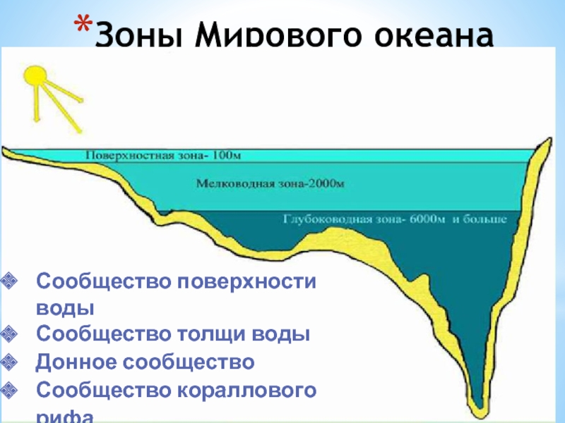 Зоны Мирового океанаСообщество поверхности водыСообщество толщи водыДонное сообществоСообщество кораллового рифаГлубоководное сообщество