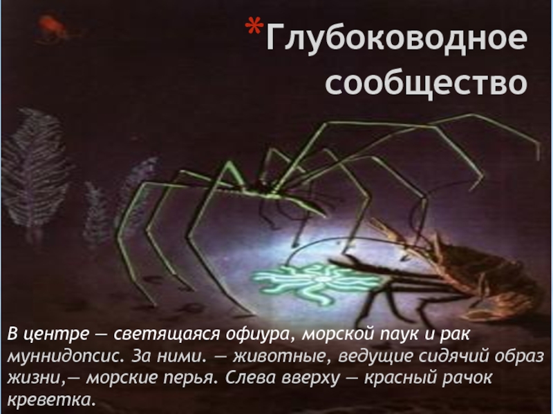 Глубоководное сообществоВ центре — светящаяся офиура, морской паук и рак муннидопсис. За ними. — животные, ведущие сидячий