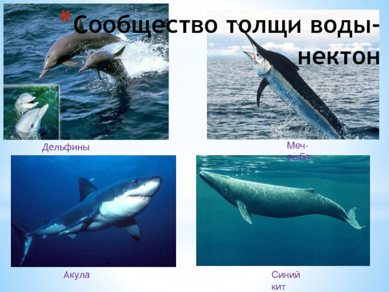 Сообщество толщи воды- нектонДельфиныСиний китМеч-рыбаАкула