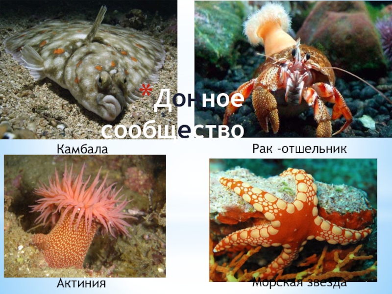 Донное сообществоКамбала Рак -отшельникАктинияМорская звезда