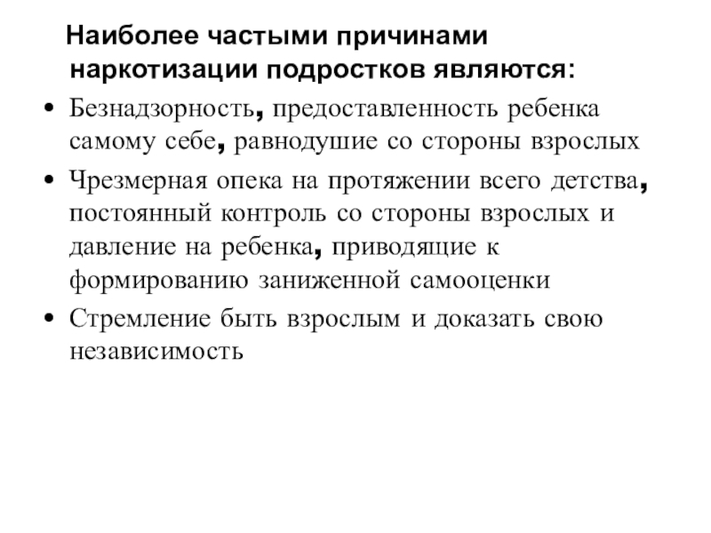 Слайд 14 Наиболее частыми причинами наркотизации подростков являются: