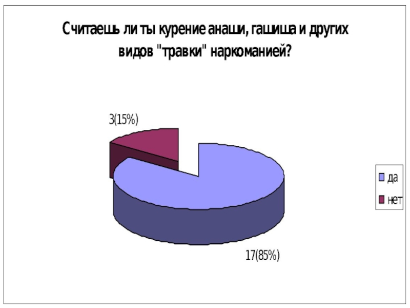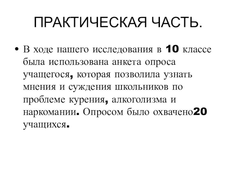 опроса учащегося, которая позволила узнать мнения и суждения школьников по проблеме курения, алкоголизма и наркомании. Опросом было охвачено20 учащихся.